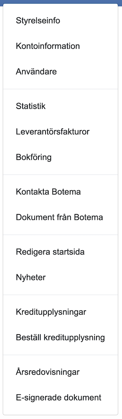 - Kontakta Botema: Här är vår meddelandetjänst där styrelsen på ett säkert sätt kan skicka meddelanden och filer till oss på Botema och tvärtom.