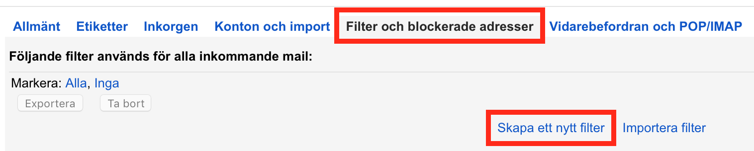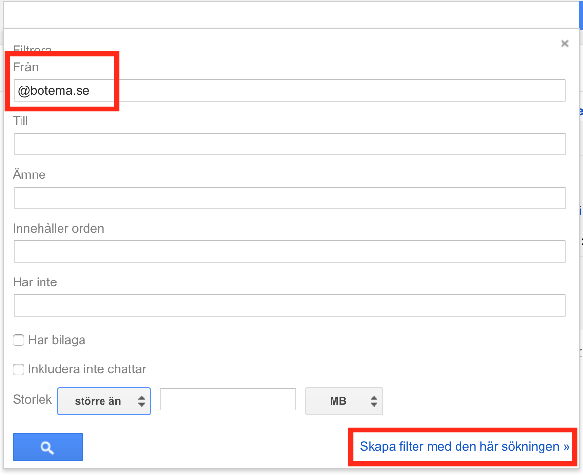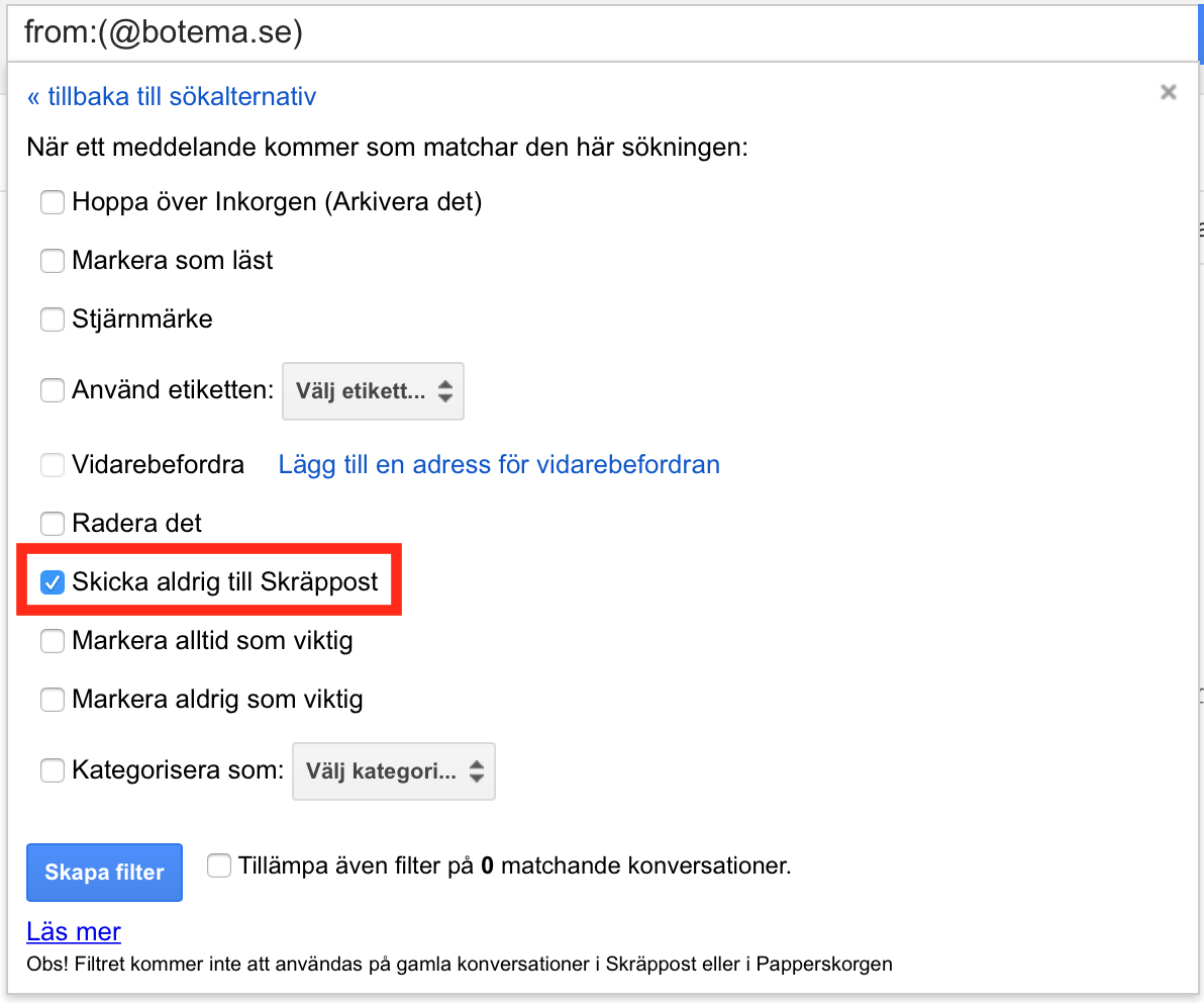 Skapa ett filter som aldrig lägger e-post från botema.se som skräppost.