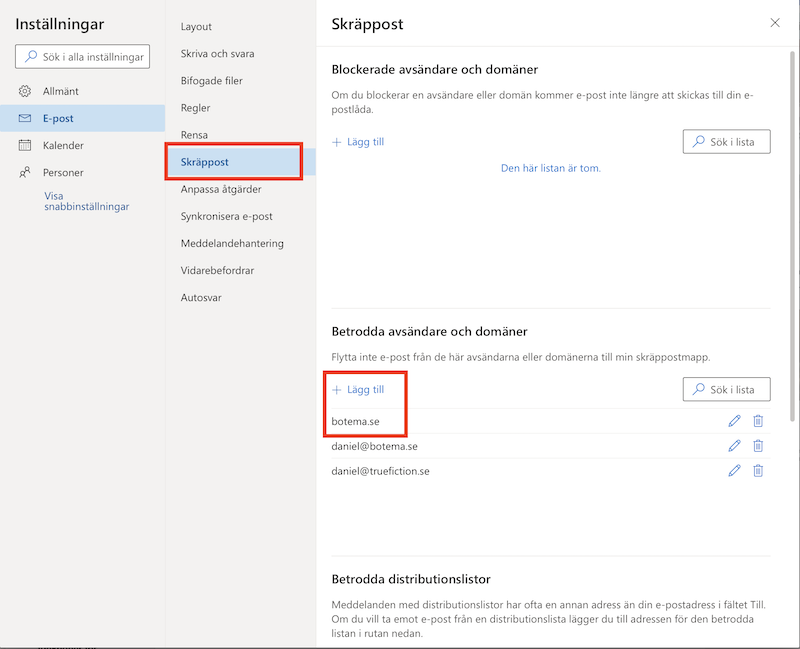 - Klicka på "+ Lägg till" under "Betrodda avsändare och domäner".